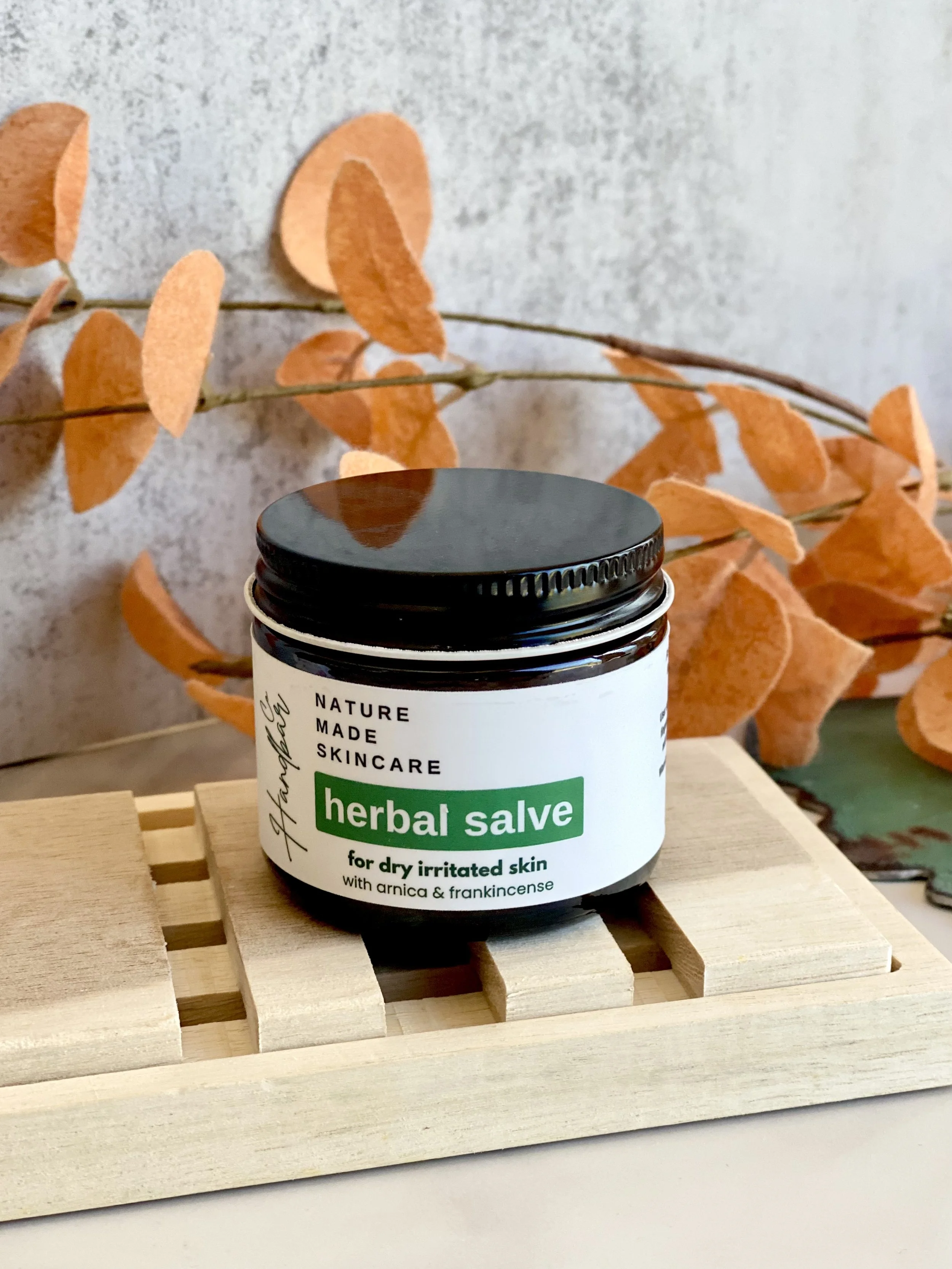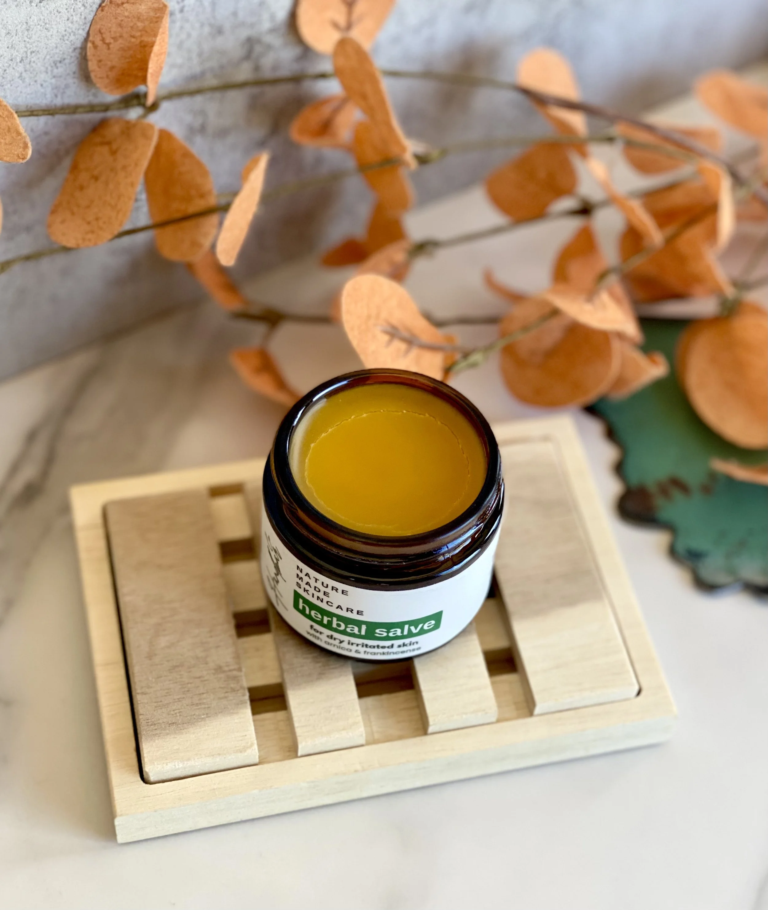 Herbal salve is made with arnica and calendula creating a soothing environment for the most troubled skin. Excellent moisturizer for eczema and overly dry skin (heels, knuckles, elbows) caused by over washing, dry environment, winter dryness.